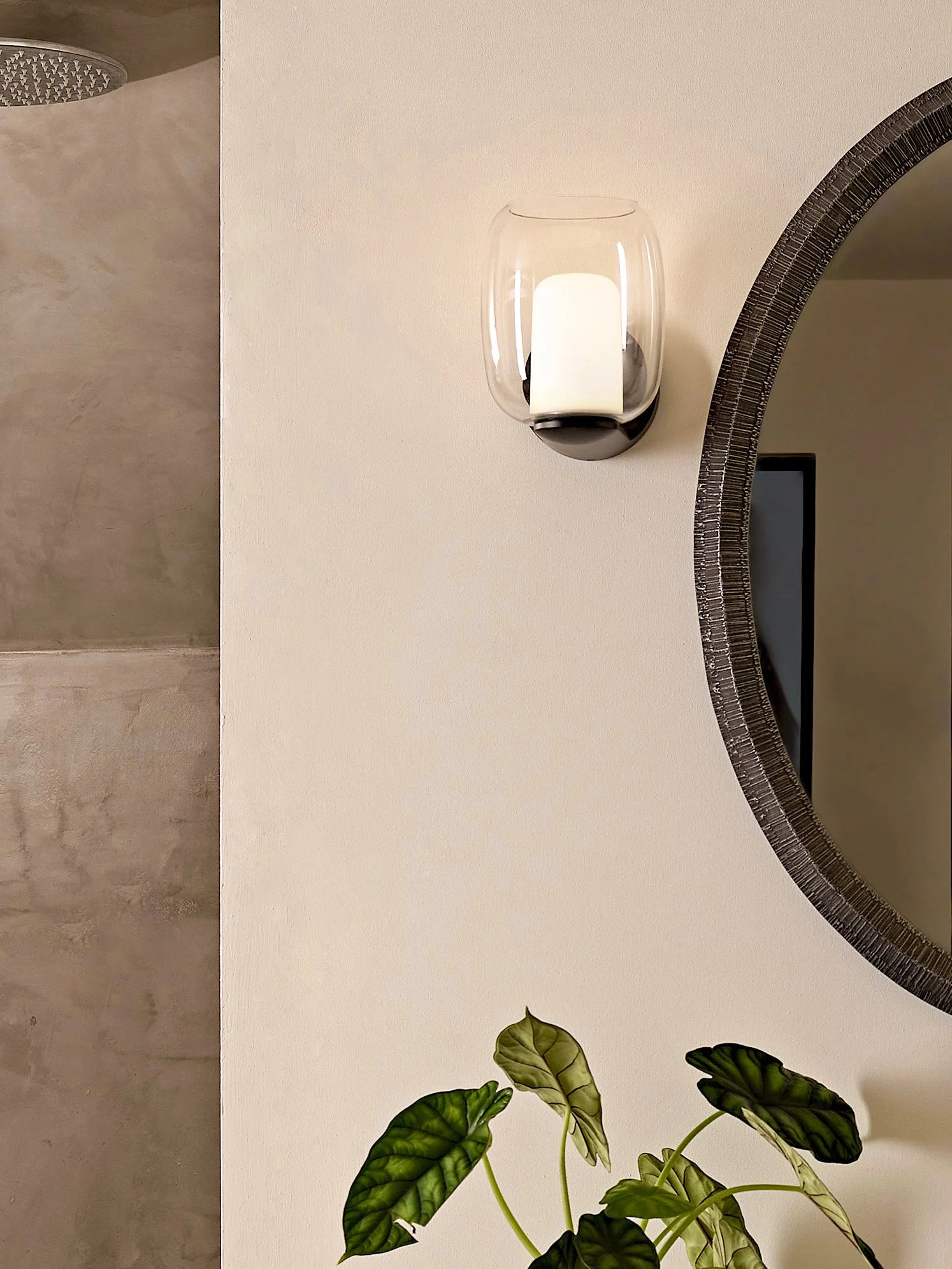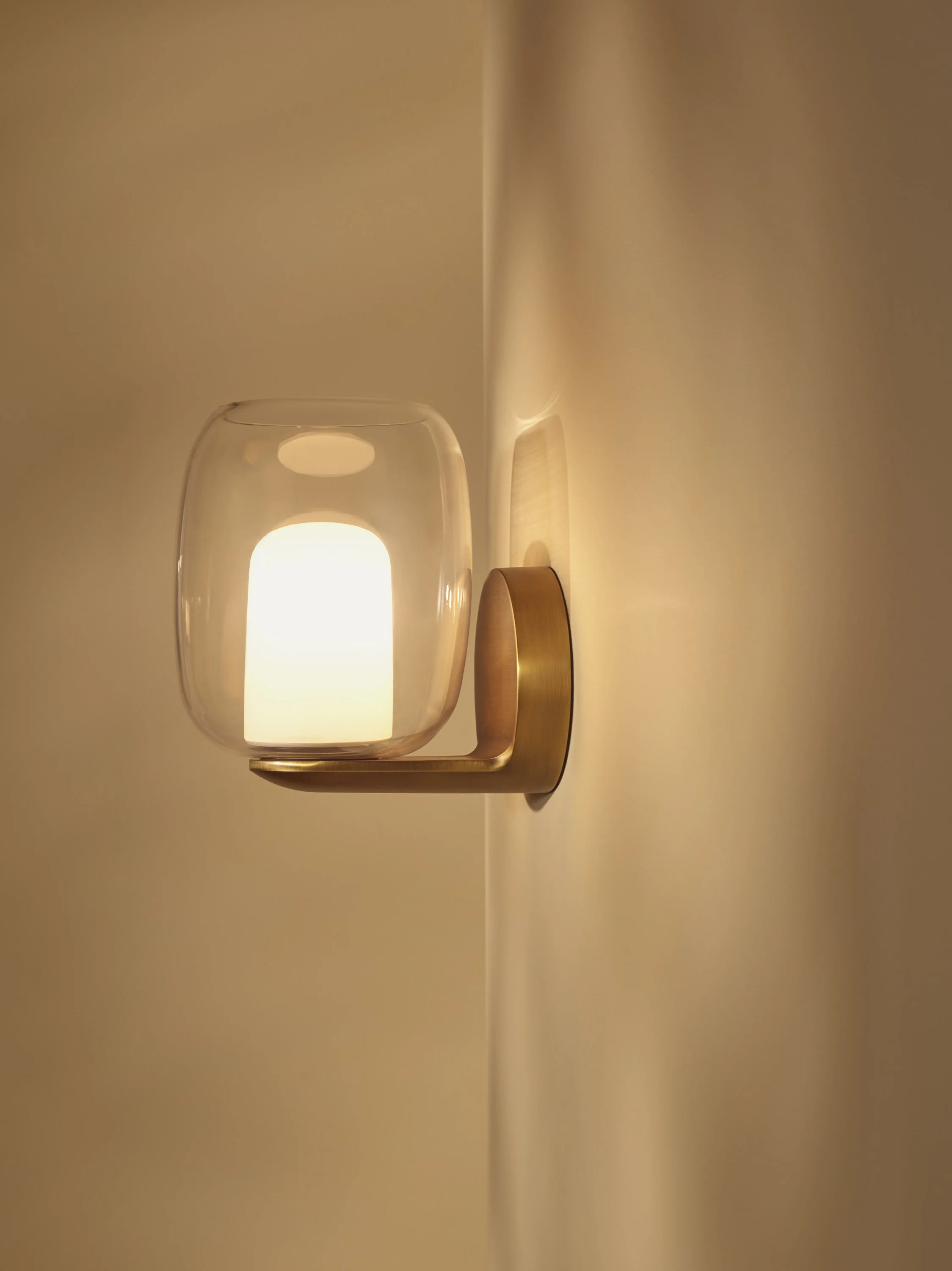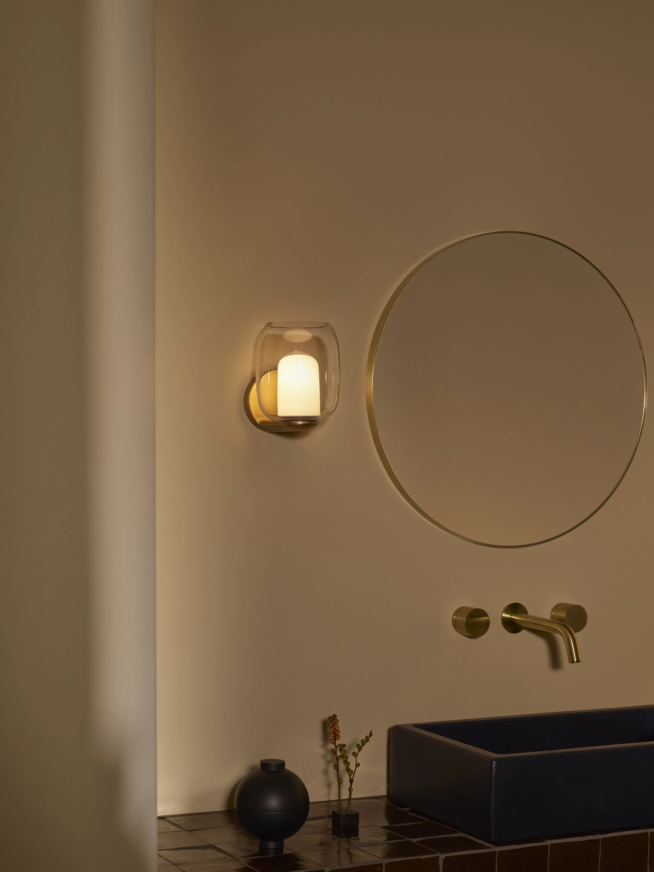 The wall light is designed for installation beside a mirror, providing a combination of functional task lighting and ambient illumination. The glass shade rests effortlessly on the supporting arm, with concealed fixings maintaining a clean, considered finish.