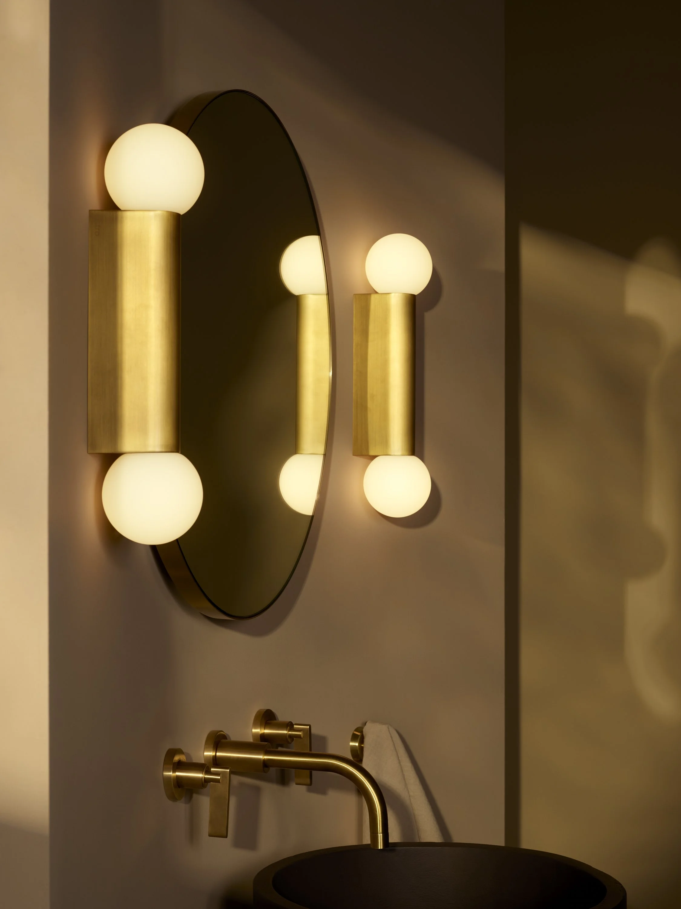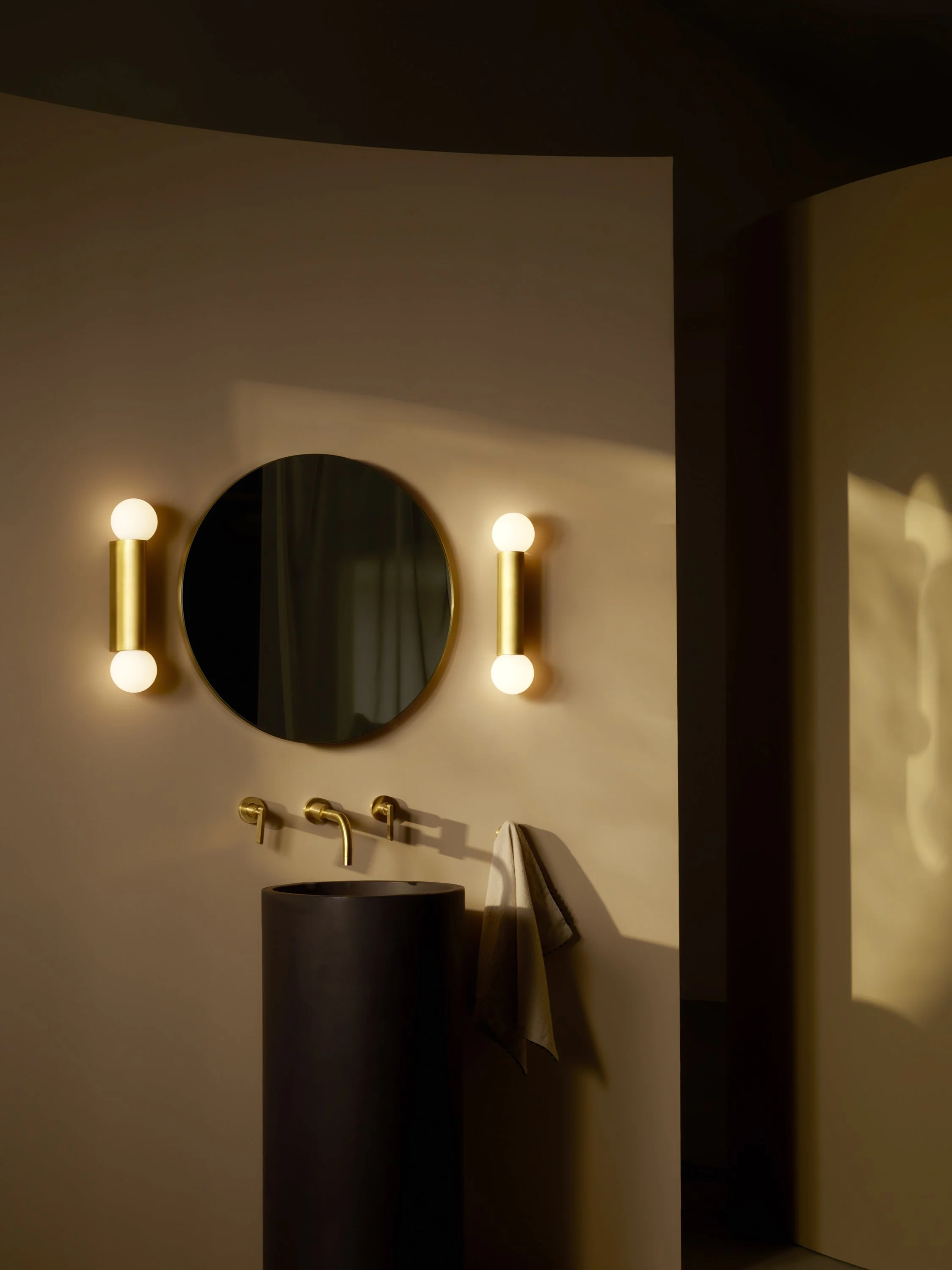 This simple geometric bathroom wall light is designed for use alongside mirrors and can be mounted vertically or horizontally. Its replaceable opal-glass shade diffuses an ambient glow. The body, available in matt brass, matt black or polished chrome, is die-cast for enduring quality and a crisp finish. IP44 rated for safe use within bathroom areas.